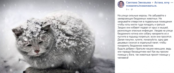 В этой же группе астанчанка Светлана Зиновьева призвала заботиться о бездомных животных.