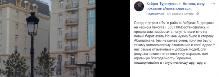 Например, житель столицы Кайрат Турекулов в Facebook в группе "Астана, хочу похвалить/пожаловаться" поблагодарил девушку, которая предложила его подвезти.