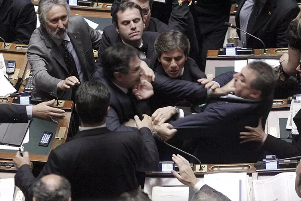 Список возглавляет столкновение члена оппозиционной партии FLI Клаудио Барбато (слева) и Фабио Раньери (справа) из Северной Лиги в итальянском парламенте в Риме. Итальянские депутаты подрались 25 октября 2011 года. The Guardian иронизирует, назвав причиной боя напряженность из-за жесткой программы экономических реформ, которая ударила в голову.