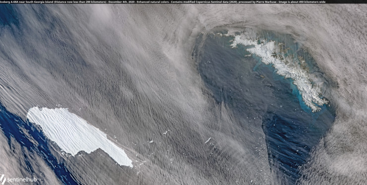 Исследователи давно наблюдают за развитием этого события, поскольку айсберг, известный под названием А68а, размером примерно с сам остров. Он продвигается вперед более трех лет с момента отделения от ледникового поля Антарктического полуострова в июле 2017 года, площадь его составляла почти 6000 квадратных километров. С тех пор он постепенно теряет массу, так как от него откалываются новые куски.