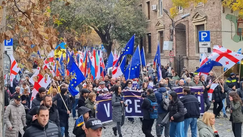 В Тбилиси состоялось шествие сторонников евроинтеграции Грузии. Люди вышли на улицу под девизом "Наш голос - Евросоюзу", передает Tengrinews.kz со ссылкой на Euronews и Грузию-Онлайн.
