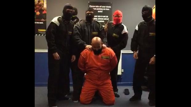 На видео снят человек в оранжевом комбинезоне, стоящий на коленях в окружении пятерых людей в балаклавах. "Аллах велик", - говорит один из них, имитируя арабский акцент. За кадром слышны смех и улюлюканье. Видео заканчивается сценой "обезглавливания" человека в оранжевом комбинезоне с помощью вешалки.