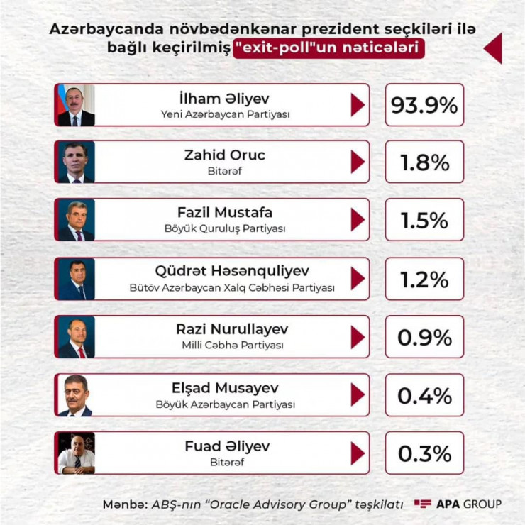 Вечером 7 февраля американская организация Oracle Advisory Group обнародовала результаты exit-poll, проведенного на внеочередных президентских выборах в Азербайджане.