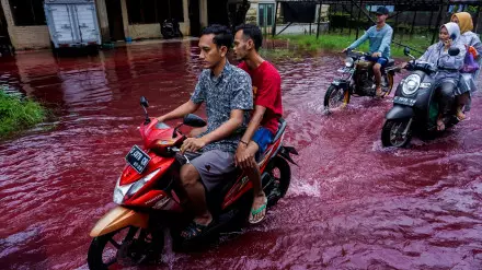 Наводнение стало причиной затопления фабрики по производству традиционного красного красителя батика в Индонезии, к югу от города Пекалонган. Официальные лица заявили, что цвет воды изменился из-за якобы безвредной краски для ткани, которую использовали несколько фабрик в этом районе.