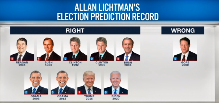 Лихтман практически безошибочно определял победителей президентских гонок в США, начиная с 1984 года, и использует для этого систему анализа из 13 факторов или "ключей".