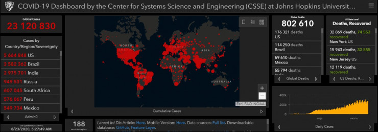 По данным университета, в мире COVID-19 заболели 23 120 830 человек, жертвами инфекции стали 802 610 пациентов, еще 14 842 382 человека выздоровели.