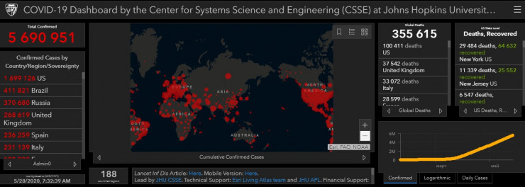 По данным университета, в мире COVID-19 заболел 5 690 951 человек, жертвами инфекции стали 355 615 пациентов, еще 2 350 071 человек выздоровел.
