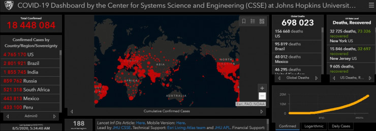 По данным университета, в мире COVID-19 заболели 18 448 084 человека, жертвами инфекции стали 698 023 пациента, еще 11 048 174 человека выздоровели.