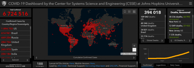 По данным университета, в мире COVID-19 заболели 6 724 516 человек, жертвами инфекции стали 394 018 пациентов, еще 2 996 832 человека выздоровели.