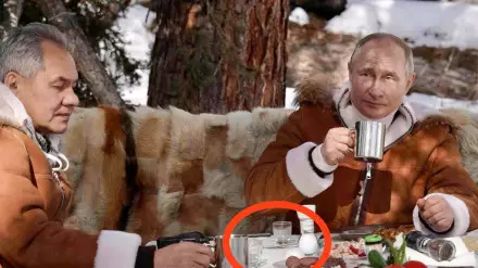 Путин сам управлял вездеходом, на пассажирском сиденье сидел Шойгу. Глава государства вместе с министром обороны, гуляя по тайге, прошли по подвесному мосту через реку, понаблюдали в бинокль за местной фауной. После прогулки они пообедали там же в тайге. Расположились они на лавках, на которых были накинуты шкуры. На столе уже была приготовлена колбаса, нарезаны помидоры, огурцы и редис.
