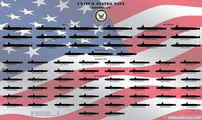По состоянию на 1 апреля 2018 года у Соединенных Штатов, по данным Naval Analyses, насчитывалась 71 субмарина, у России - 72, у Китая - 76.