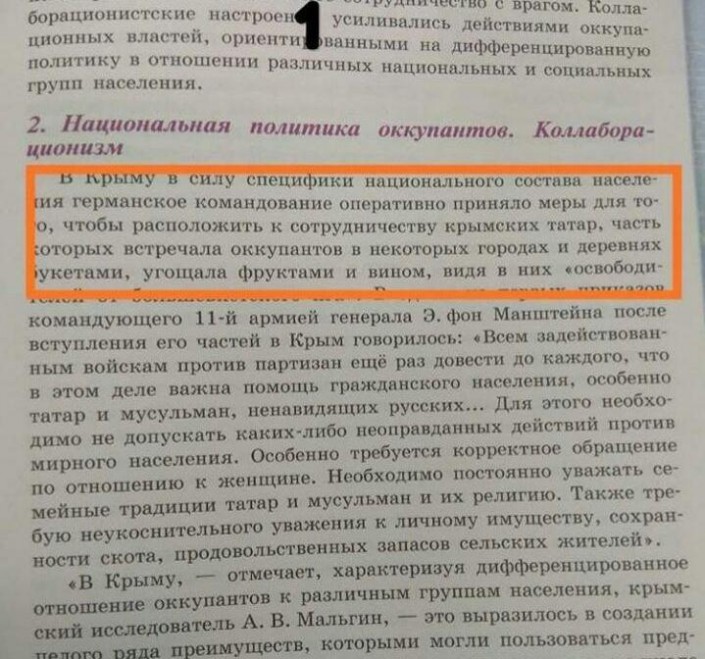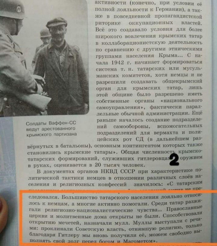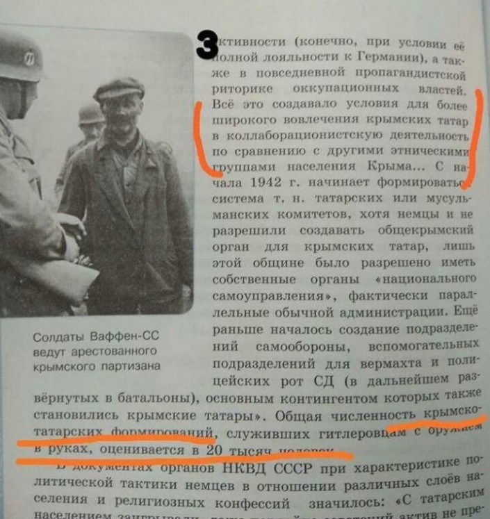 "Авторы учебного пособия совершенно безосновательно утверждают, что "численность крымско-татарских формирований, служивших гитлеровцам с оружием в руках, оценивается в 20 тысяч человек", а 14 тысяч крымских татар призывного возраста принимали участие в борьбе с партизанами", - приводит агентство текст документа.