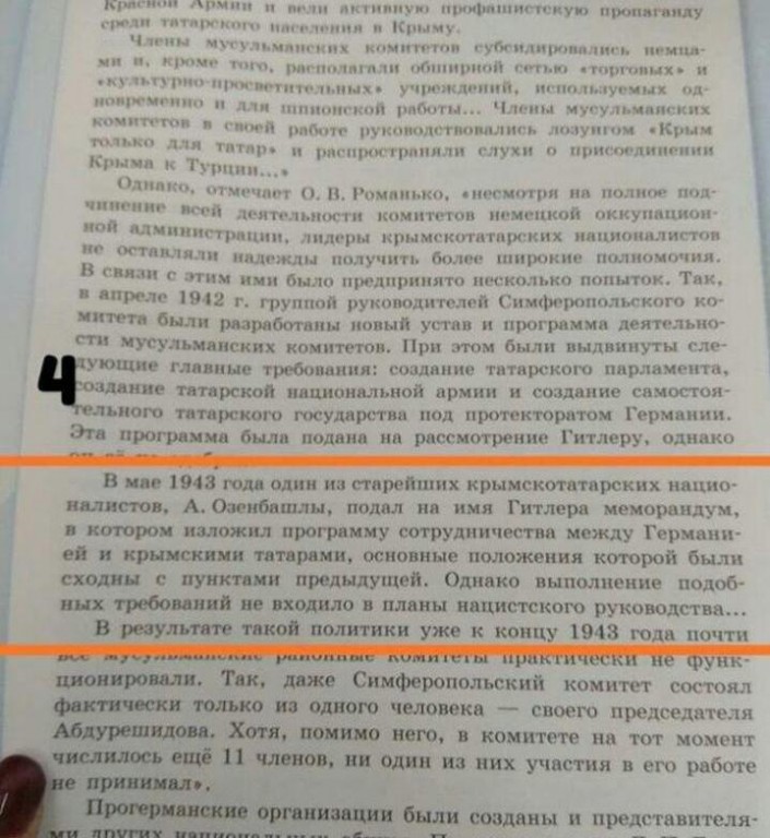 В совете подчеркнули, что авторы учебного пособия умолчали о других исторических, документально обоснованных фактах, показывающих весомый вклад крымско-татарского народа в победу в Великой Отечественной войне.