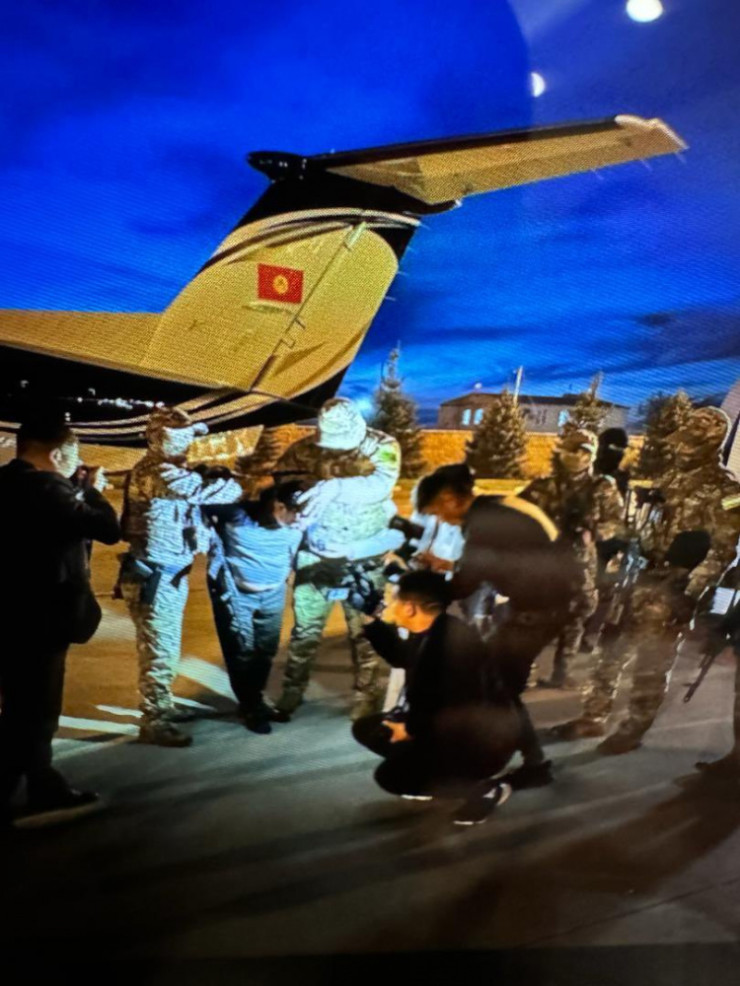 В соцсетях распространились фотографии доставки Матраимова в Бишкек. На одном снимке олигарх в наручниках находится на борту самолета. Второе фото сделано в аэропорту Бишкека - мужчину вывели из самолета.