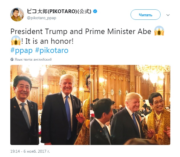 По данным РИА Новости, Pikotaro должен был исполнить свою песню во время обеда, на котором присутствовали Трамп и премьер Японии Синдзо Абэ. Как отмечают зарубежные СМИ, музыку Pikotaro любят внуки американского президента.