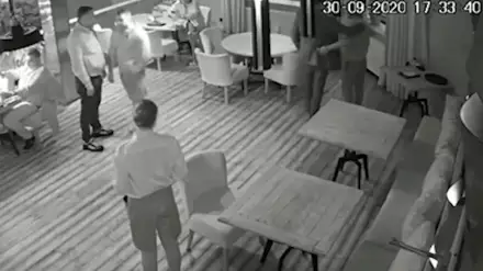 В это время трое других мужчин блокируют доступ к столу. Через некоторое время злоумышленник уходит. По пути назад он приближается к столику Саакашвили и что-то говорит, делая жест рукой. Михо встает и что-то ему отвечает. После чего незваный гость идет к выходу.
