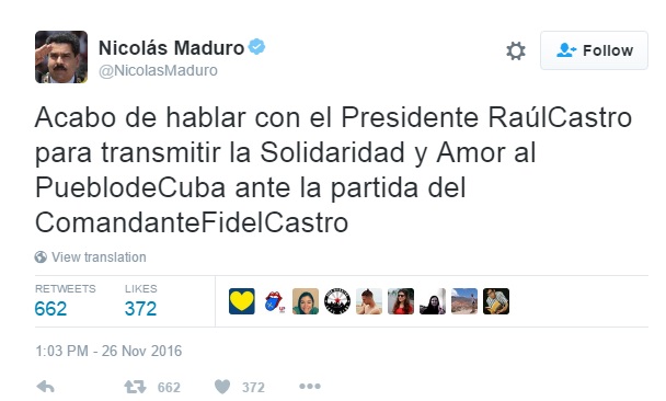 Кроме того, соболезнования высказали и лидеры других государств. Одним из первых стал президент Венесуэлы Николас Мадуро. "Только что я говорил с президентом Раулем Кастро, я выразил ему и всему кубинскому народу поддержку и солидарность после ухода команданте Фиделя Кастро. Мы все, мы революционеры всего мира, должны сберечь его наследие и продолжать его дело", - написал Мадуро в своем аккаунте в Twitter.