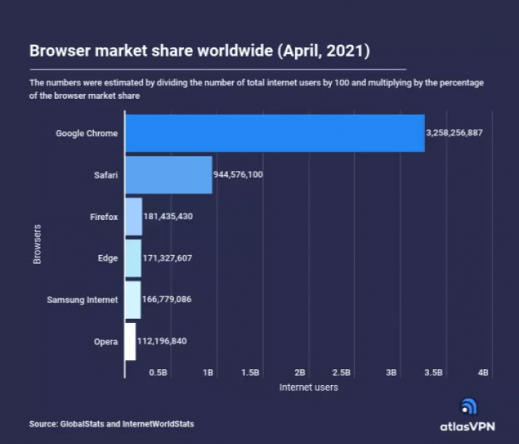 Обычно доля пользователей браузеров приводится в процентах, но Atlas VPN перевела эти данные в абсолютные величины. Итак, если верить изысканиям Atlas VPN, то у Google Chrome по состоянию на апрель 2021 года насчитывалось 3 258 256 887 пользователей, что составляет 41 процент всего населения Земли.