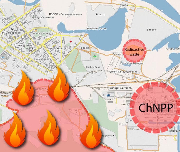 "Ситуация критическая. Огонь добрался к Припяти и находится в двух километрах прямо от хранилищ радиоактивных отходов "Подлесный", где расположены наиболее высокоактивные радиационные отходы всей Чернобыльской зоны, и от самой ЧАЭС", - написал он.
