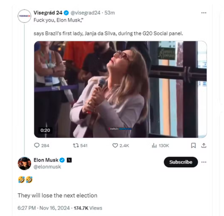 Первая леди Бразилии присела, а затем, вставая, в шутку произнесла: "Я думаю, это Илон Маск! Я тебя даже не боюсь… Пошел ты, Илон Маск!".