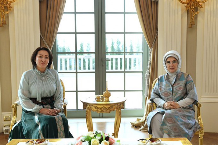На это мероприятие первая леди Кыргызстана переоделась в национальное платье с белдемчи. Эмине Эрдоган поделилась фотографией со встречи на своей странице в Twitter.