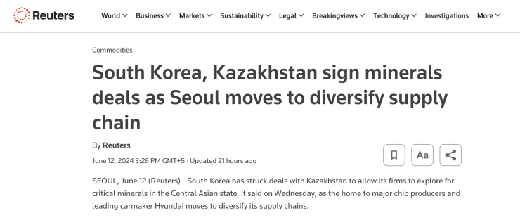 Агентство Reuters подчеркивает важность сделки Южной Кореи с Казахстаном, которые позволят ее компаниям вести разведку полезных ископаемых. Корея, как родина крупных производителей микросхем и автопроизводителей, стремится диверсифицировать свои цепочки поставок.