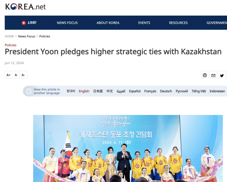 Еще один правительственный портал Korea.net выпустил статью под заголовком "Президент Юн пообещал укрепить стратегические связи с Казахстаном". Акцент в этой публикации сделан на связи с этническими корейцами, проживающими в Казахстане. Похвалив корейцев за их труд, который помог значительно продвинуть двустороннее сотрудничество, президент Юн пообещал укреплять связь с этническими корейцами, проживающими в Казахстане, в том числе в плане бизнеса.