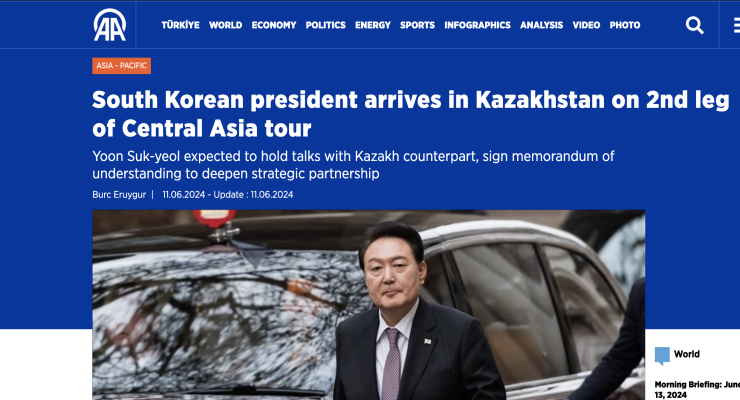 О визите южнокорейского президента в Казахстан написали также и турецкие СМИ. Крупное турецкое агентство Anadolu Ajansı отметило важность переговоров между Казахстаном и Южной Кореи, а также сообщило о подписании меморандума о взаимопонимании для углубления стратегического партнерства.