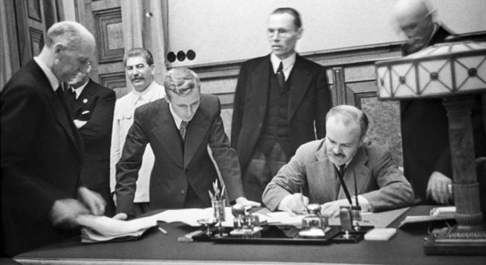Репродукция. Председатель Совета Народных Комиссаров СССР и нарком иностранных дел СССР Вячеслав Молотов подписывает советско-германский пакт о ненападении. 23 августа 1939 года. © ТАСС