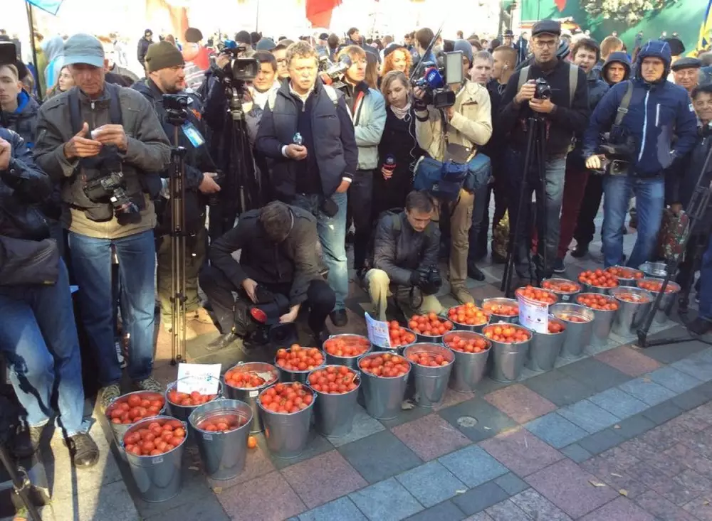 "Помидорный" митинг возле Верховной Рады проходит в Киеве, передает корреспондент Tengrinews.kz с места событий.