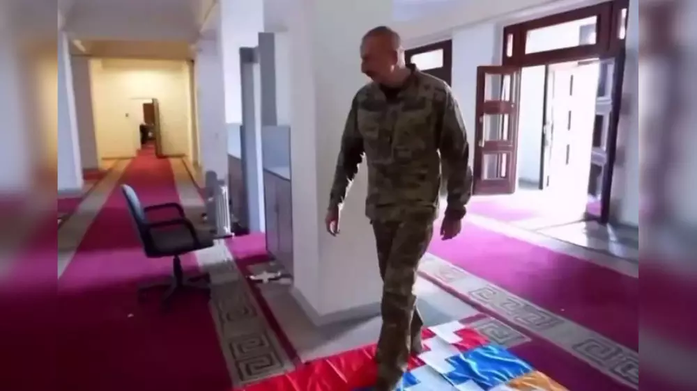 На опубликованной в сети видеозаписи можно увидеть, как Ильхам Алиев в военной форме входит в здание под звучание торжественной музыки. Азербайджанский лидер шагает через холл, наступая на флаг Карабаха, затем внимательно взирает на символ и делает еще несколько шагов, пересекая его.