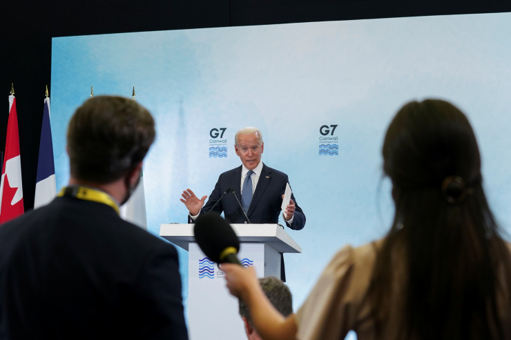 Джо Байден провел пресс-конференцию в течение 12 минут, чтобы подвести итоги по окончании саммита G7, состоявшегося в Великобритании, и рассказал, что его команда спланировала, на какие вопросы он будет отвечать. Президент пошутил, что не должен отвечать на лишние вопросы прессы, иначе у него будут проблемы, если он нарушит их план.