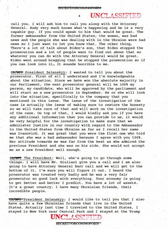 Газета Wall Street Journal со ссылкой на источники сообщила, что Трамп при этом разговоре неоднократно оказывал давление на Зеленского, чтобы тот открыл расследование в отношении сына Байдена Хантера, а также раскрыл некую секретную информацию. Трамп это отрицает и считает, что эта история сфабрикована.