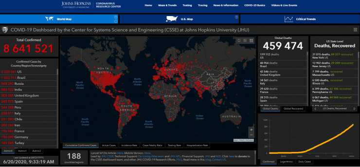 По данным университета, в мире COVID-19 заболели 8 641 120 человек, жертвами инфекции стали 459 474 пациента, 4 234 310 человек выздоровели.