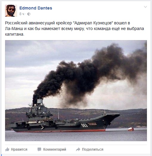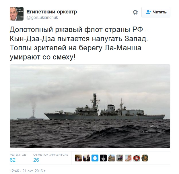 Daily Mail отреагировала на приближение группировки ВМФ России воинственным предупреждением. "Берегитесь, русские. Огнедышащий "Дракон" (название корабля - прим.) идет за вами. Сверхсовременный королевский эсминец проследит за тем, чтобы ударный флот Путина покинул Ла-Манш", - написала газета. При этом издание иронизирует над "Александром Кузнецовым", называя его устаревшим ржавым кораблем.