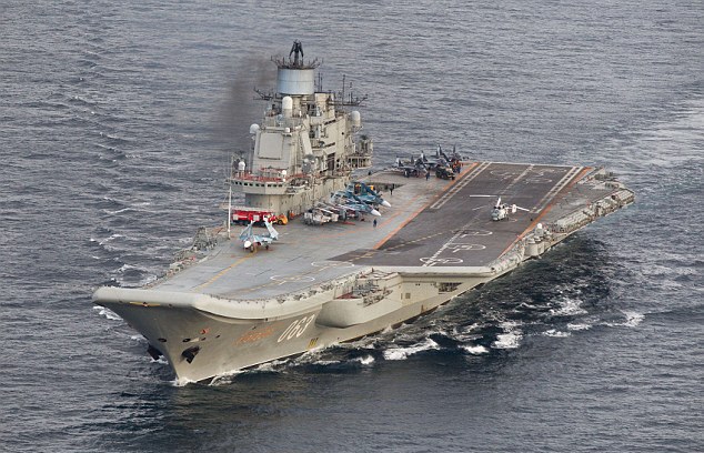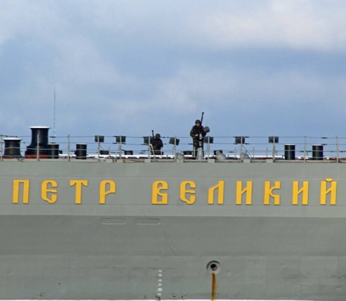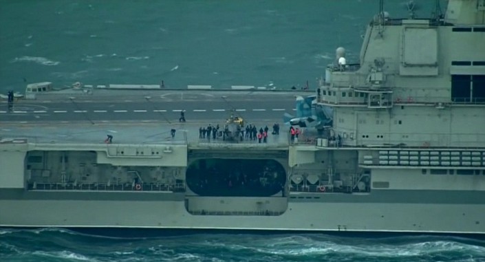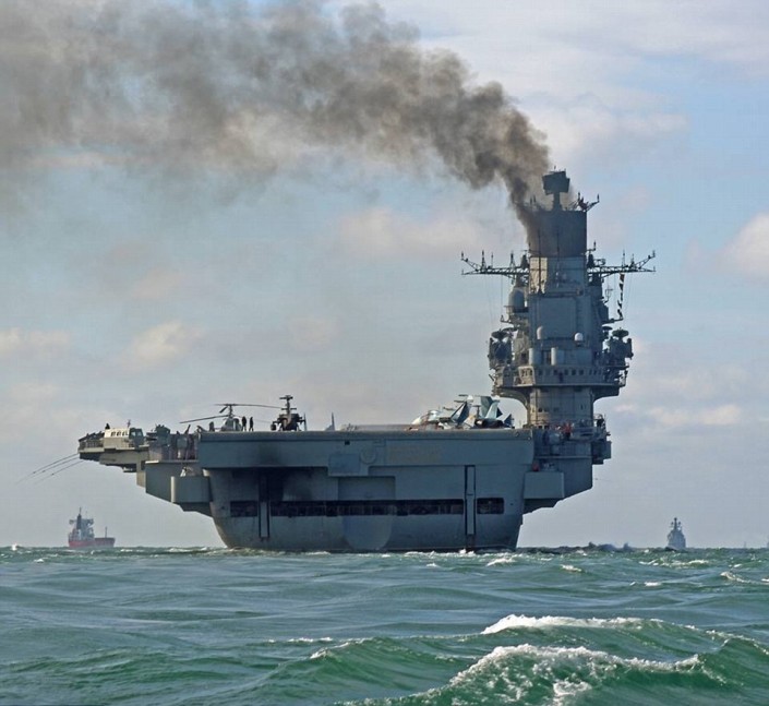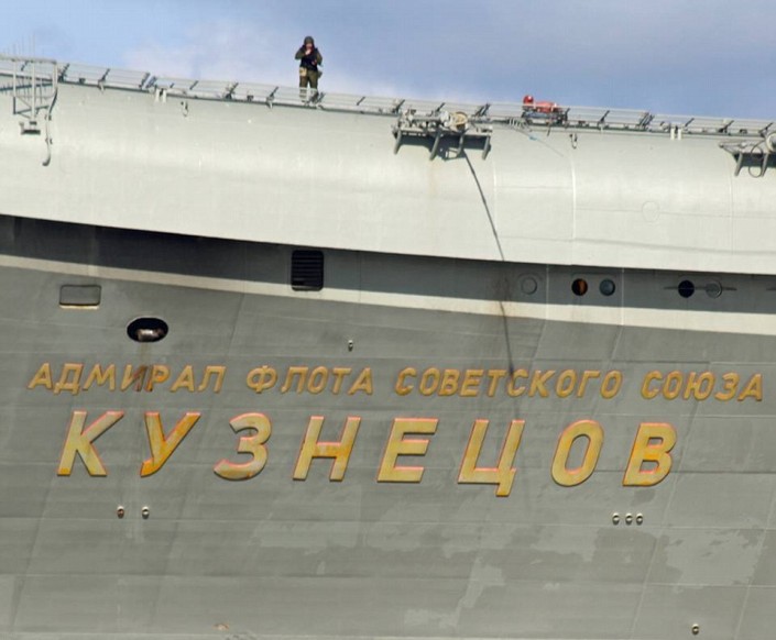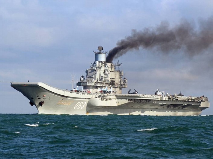 Помимо "Адмирала Кузнецова", в российскую флотилию входят атомный ракетный крейсер "Петр Великий", два больших противолодочных корабля класса "Удалой" и четыре других корабля.