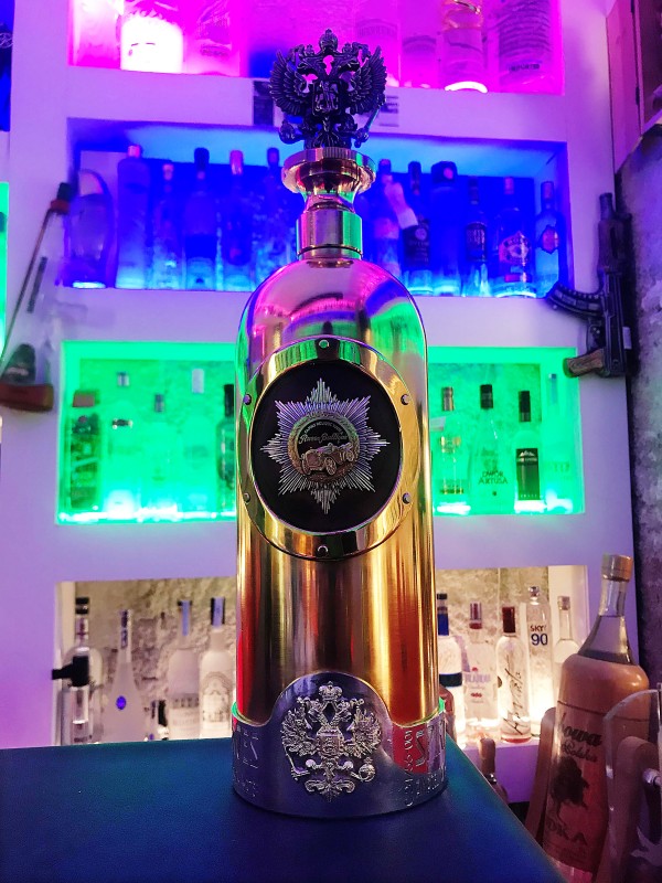 Бутылка примечательна тем, что сделана из золота и серебра, декорирована изображением гоночного автомобиля "Руссо-Балт", а водка фильтруется через насадку с бриллиантами. На пробке - герб Российской империи, украшенный драгоценными камнями.