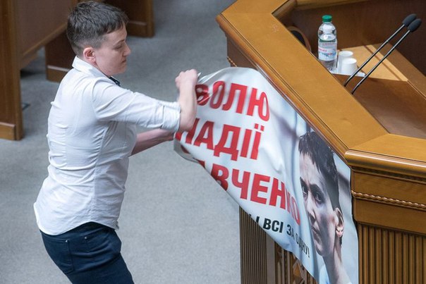 После своего выступления Савченко запела гимн Украины, который подхватили все депутаты, а затем сняла свой портрет с трибуны, который висел там все последнее время, и заменила фотографиями тех, кто продолжает находиться в заключении.