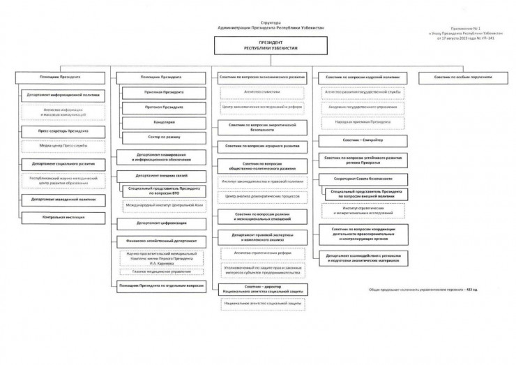 Согласно новой структуре, после президента по иерархии идут советники, в том числе Сардор Умурзаков, который сохраняет второе место, там же идут помощники, а после этого на четвертой позиции указаны департаменты.