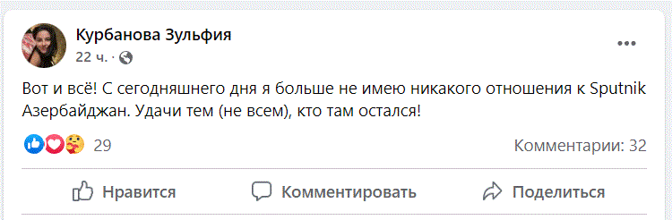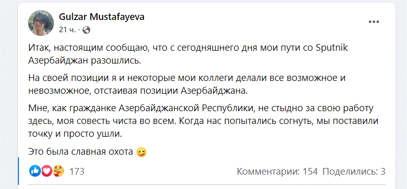 "С сегодняшнего дня мои пути со "Sputnik Азербайджан" разошлись. На своей позиции я и некоторые мои коллеги делали все возможное и невозможное, отстаивая позиции Азербайджана. Мне, как гражданке Азербайджанской Республики, не стыдно за свою работу здесь, моя совесть чиста во всем. Когда нас попытались согнуть, мы поставили точку и просто ушли", - написала она.