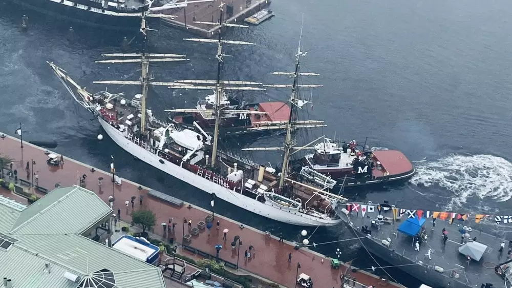 NEW: Video shows the Danish ship Danmark colliding with the USS Minneapolis-St. Paul, as the Danmark was being tugged out of the Inner Harbor #fleetweekfail pic.twitter.com/fplUhYuhCk