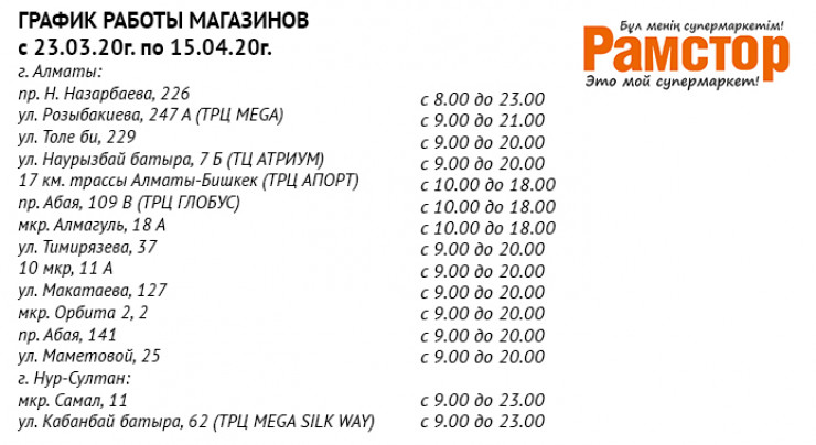 С более подробной информацией о работе сети супермаркетов "Рамстор", а также об актуальных ценах, акциях и скидках, вы можете узнать на сайте www.ramstore.kz и в Instagram-аккаунте.