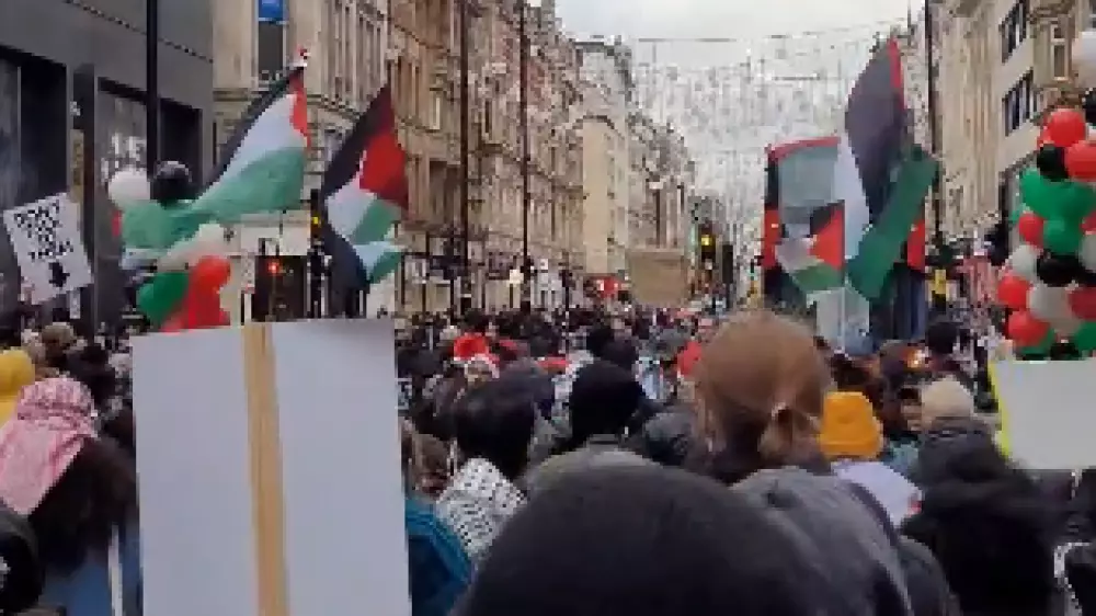 Участники марша "1000+" прошли от площади Сохо до Оксфорд-стрит, где расположены фешенебельные магазины Лондона, требуя прекращения огня в секторе Газа. Там погибло уже более 20 тысяч человек.