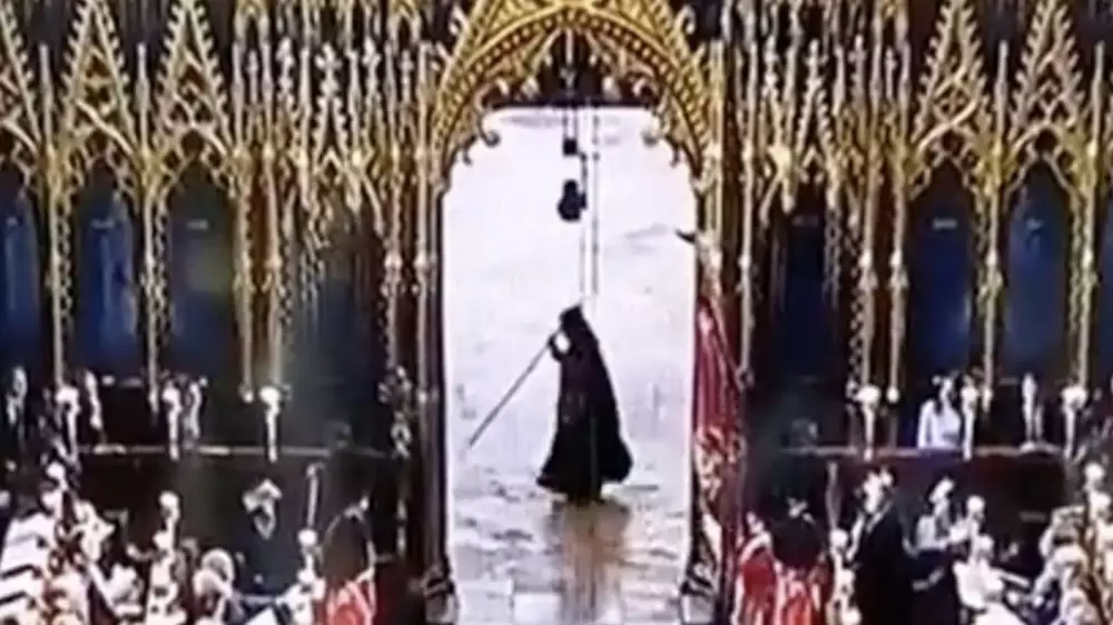 Инцидент произошел во время официальной процедуры коронации Карла III. У входа в Вестминстерское аббатство промелькнула черная фигура в капюшоне с чем-то похожим на посох в руках.