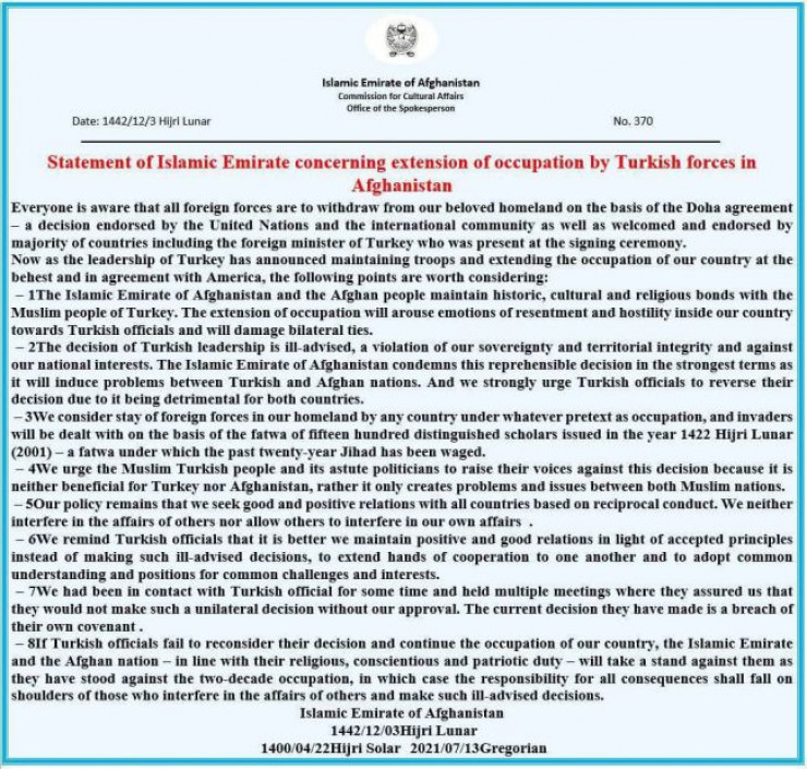 Тем самым талибы дали ответ на предложения Анкары оставить свои войска для охраны Кабульского аэропорта. Несмотря на это, Турция до последнего времени заявляла, что оставит своих военных для контроля и безопасности в международном аэропорту Кабула.