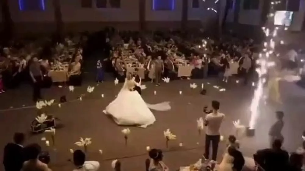 На распространенной в социальных сетях видеозаписи со свадьбы видно, как молодожены медленно танцуют, прежде чем невеста в ужасе обернулась и увидела, как пламя быстро поднимается по стенам, а вспыхнувшие куски украшения на потолке падают на пол.