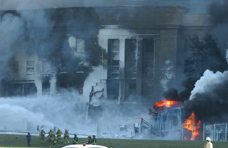 Екінші соққыдан жарты сағат өткенде үшінші лайнер Пентагонның Батыс қасбетіне құлайды. Бұл ел астанасы Вашингтон маңындағы АҚШ Қорғаныс министрлігінің ірі ғимараты еді.