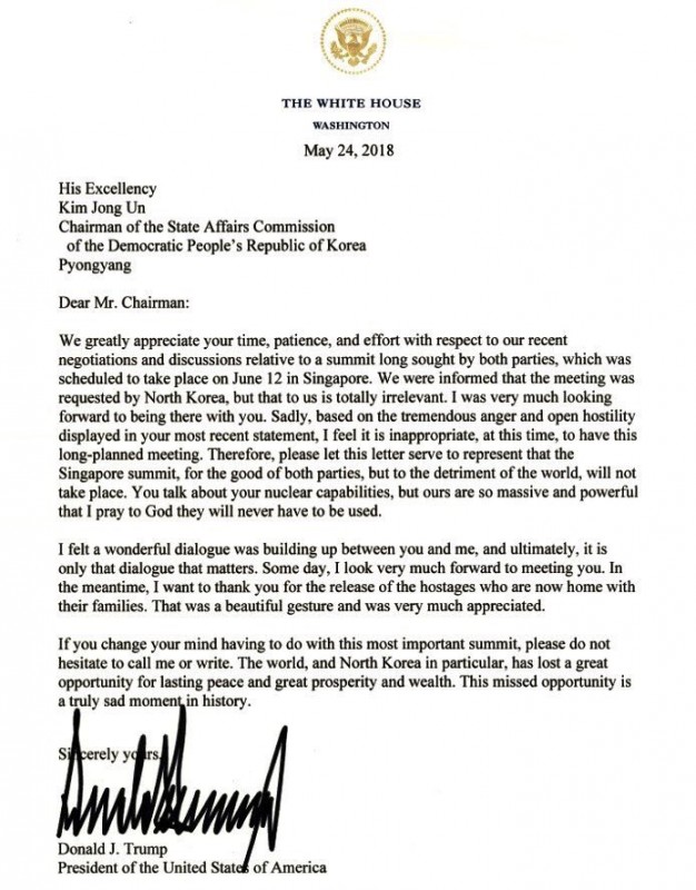 "Данным письмом сообщаю, что, к благу обеих сторон, но к невыгоде всего мира, саммит в Сингапуре не состоится", - отметил Трамп.
