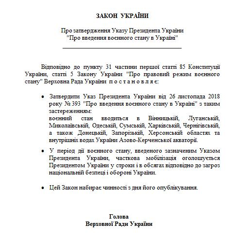 В соответствии с текстом указом президента, опубликованным на сайте Верховной Рады, военное положение вводится в Украине с 14:00 26 ноября. Оно продлится 30 дней, до 14:00 26 декабря 2018 года.