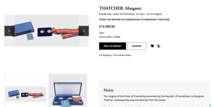 Согласно объявлению в Peter Harrington, орден "Достык" продается за 12 500 фунтов стерлингов (около 7,9 миллиона тенге). Эта награда была вручена Тэтчер в 2001 году за вклад в развитие отношений между Казахстаном и Великобританией.